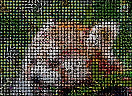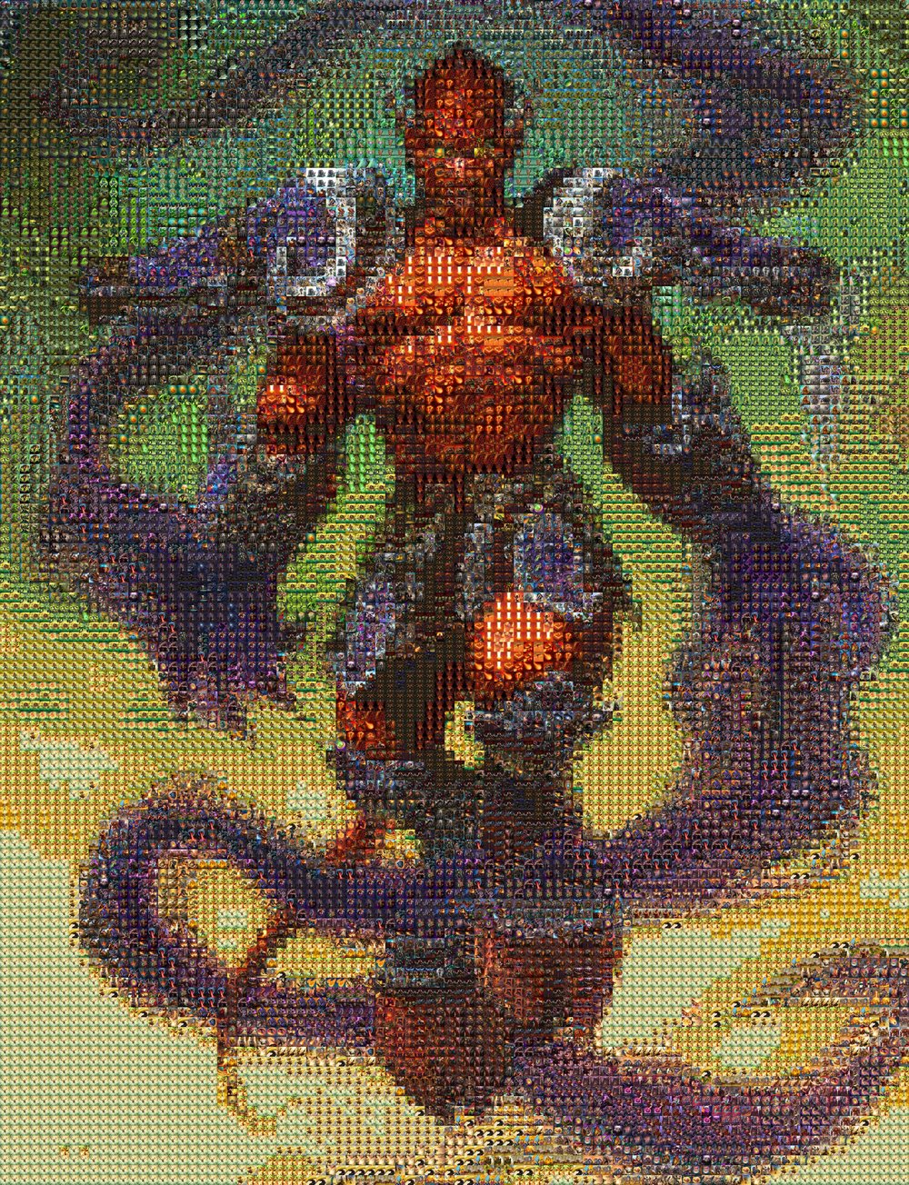 My program allows for the desired scaling of the original image as even though the scale won't preserve quality of the image, average colour's will be, so the recreated image will only look more detailed. As mentioned, this is modular, and will work with any given dataset of base blocks. Here is an example using the entire hearthstone library.